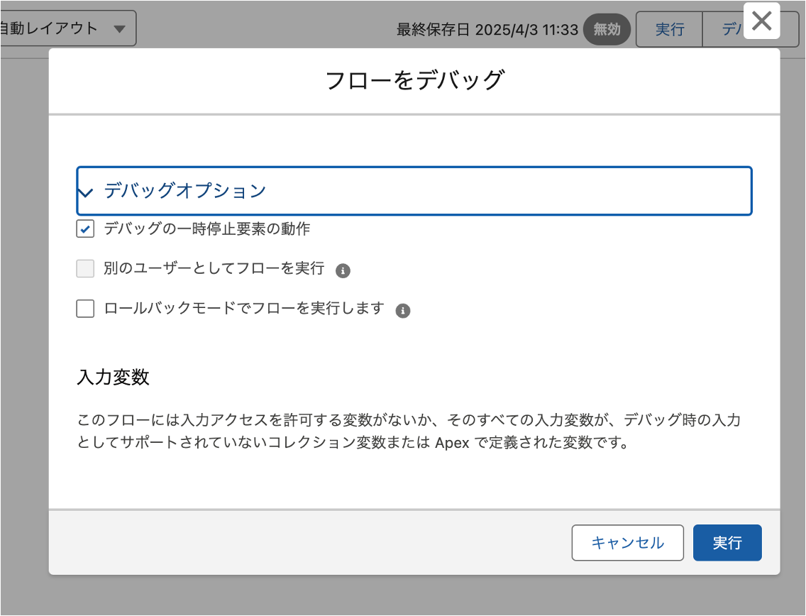 フロービルダー画面上部にある「デバッグ」ボタンをクリックして、フローのテストを実行しましょう。