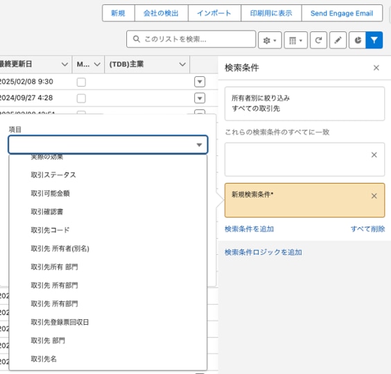 たとえば、2か月以内に活動記録がない取引先のリストが作成できます。