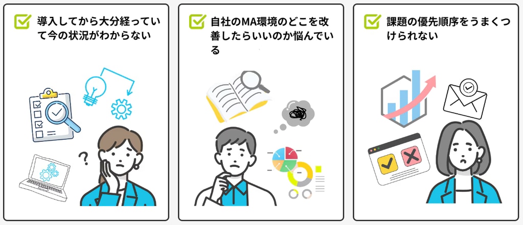A. | 成果を阻害しているポイントが明確になり、改善すべき領域の優先順位がわかります。それにより、最短で成果につなげる改善ロードマップを作成することができます。また、MAの活用度の現状を定量・定性で把握することができるのも良いポイントです。 |