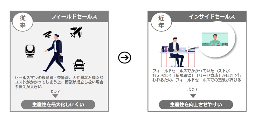 従来の営業スタイルである、顧客先へ訪問する「フィールドセールス」とは対照的で、オフィスから効率的かつスピーディーに、