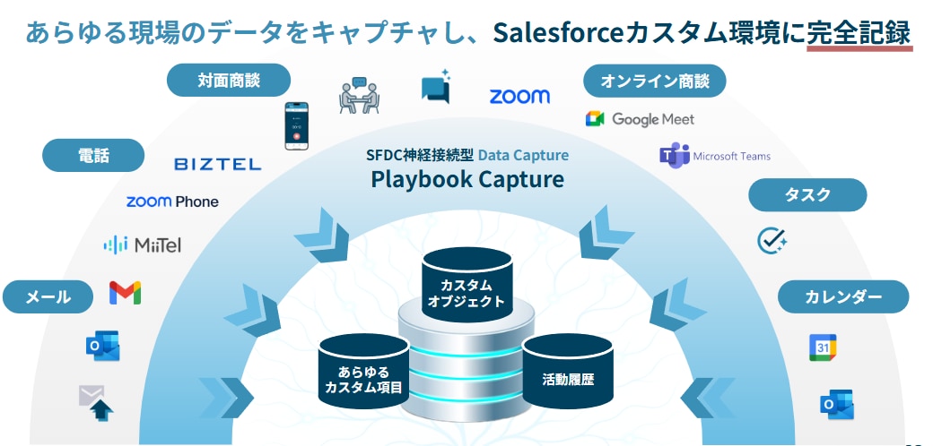 他社製品と比べると電話(キャリア携帯)、オンライン、オフライン、メールなど様々なツールと連携することができSalesforceへシームレスにデータを蓄積することが可能です。