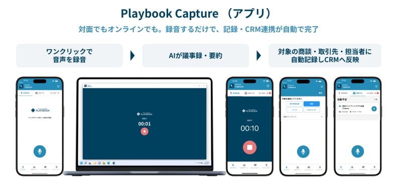 Playbook CaptureとSalesforceを連携することで、シームレスに営業データをCRMに蓄積することができ、より精密で高度な営業分析や販売戦略を打てるようになります。