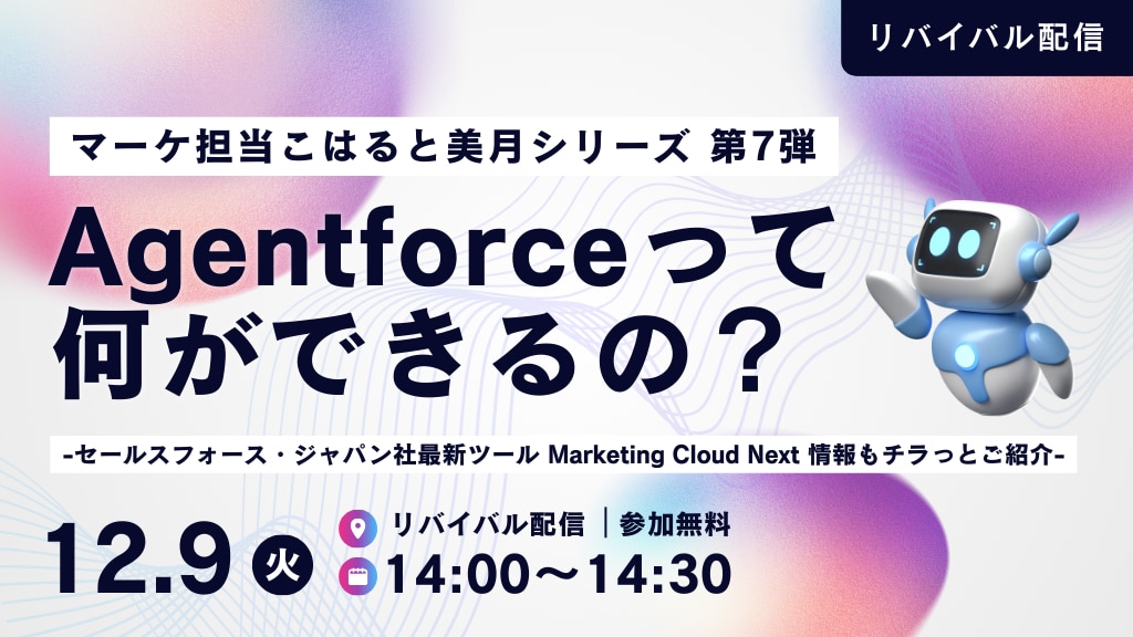 タイトル | <録画配信>Agentforceって何ができるの?【マーケ担当こはると美月シリーズ第7弾 】 |