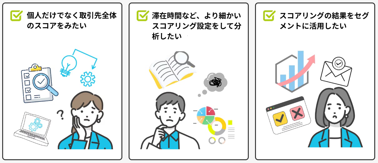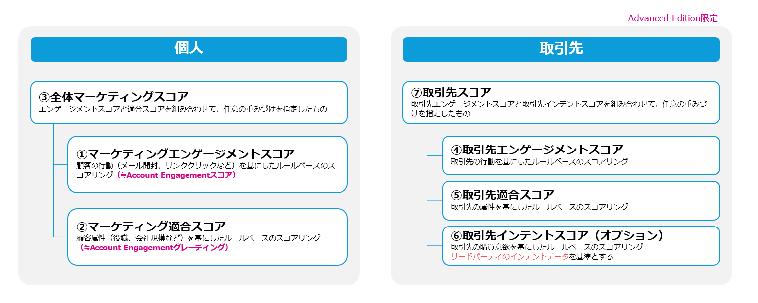 その中でも「スコアリング」は、より細かに顧客データや行動データをもとに 個人やアカウント(企業)を数値化し、